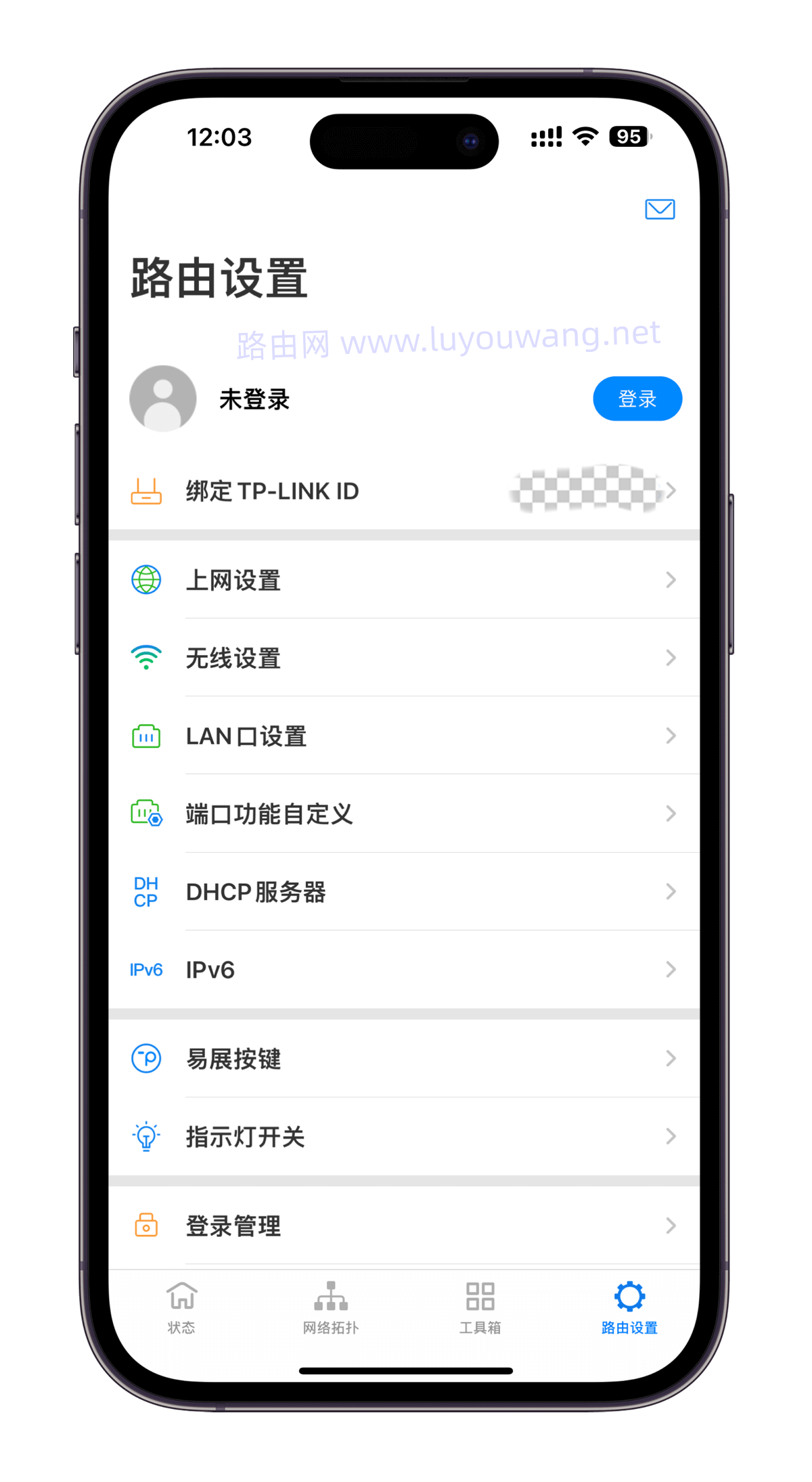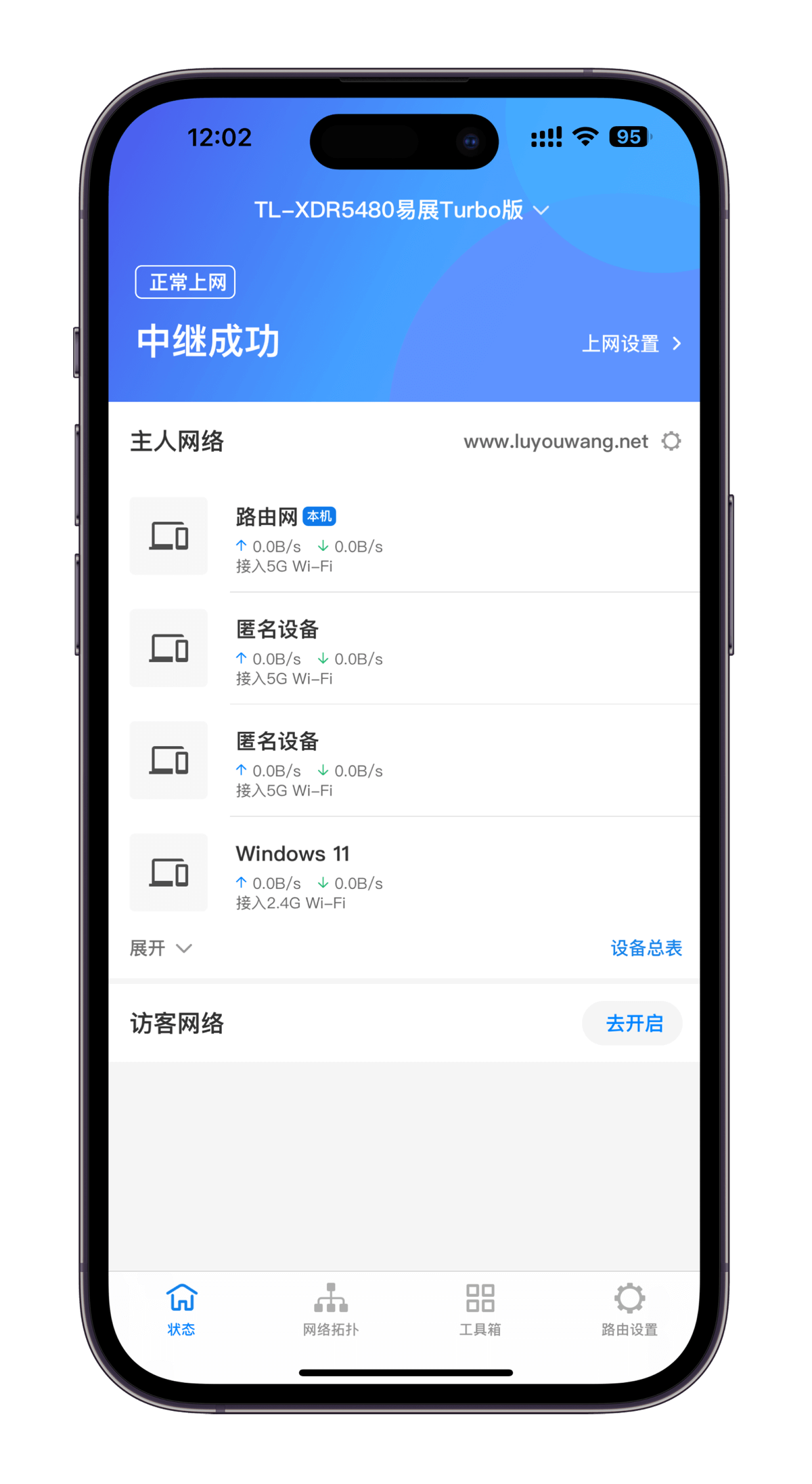 在app管理设置界面,你可以查看路由器的状态、网络拓扑图、路由器工具箱以及路由器设置。